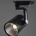 Отличный вариант трекового светильника для освещения торговых помещений. Оригинальная конструкция крепления цилиндрического плафона к кронштейну позволяет регулировать направление потока света и создавать зоны с концентрированным освещением. Монтаж осуществляется на шинный провод, что сокращает время установки и замены в случае необходимости. Материал арматуры — металл, поверхность матовая чёрного цвета.