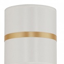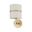 Бра стиля модерн для гостиной, кабинета или спальни имеет размеры 150x285x200 мм. Арматура светильника окрашена в золотой цвет. Лампы в комплекте - отсутствуют. В светильнике применяются лампы накаливания или светодиодная LED-лампа. Цвет плафонов - белый, золото, с матовой поверхностью. Материал плафонов - текстиль. Класс электробезопасности - I, степень пылевлагозащиты (IP) - 20. Максимальная мощность лампы (Вт) - 40. Светильник размещается на стене.
