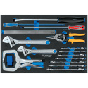 КомплектацияКлючиКлючи трещоточные комбинированные: 10, 12, 13, 14, 17, 18, 19 ммКлюч разводной: 250 мм, развод: до 30 ммКлюч разводной: 300 мм, развод: до 35 ммОтверткиОтвертка PHILLIPS: PH2×300 ммОтвертка SLOTTED: 5×300 ммШарнирно-губцевый инструментНожницы по металлу: 250 мм, режущая кромка: 38 ммЗажим с фиксатором С-образный: 280 мм, захват/глубина: до 100 ммУдарный инструментМонтировка: 458 ммУдарные клейма: «1, 2, 3, 4, 5, 6(9), 7, 8»: 8×8×61 ммИзмерительный инструментЛинейка металлическая, мм/дюйм: 335×23.7×1 мм