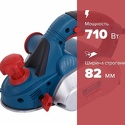 Ширина строгания 82 мм, глубина строгания 2 мм, мощность 710 Вт, скорость вращения 16000 об/мин, выборка четверти до 2 мм, v-образные желобы для снятия фасок: 1